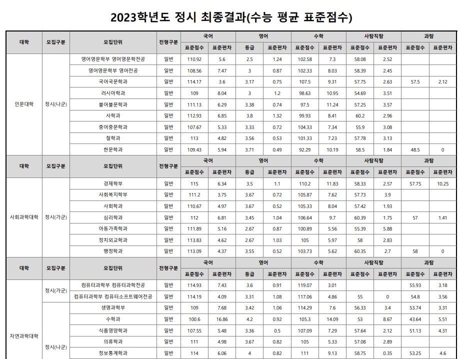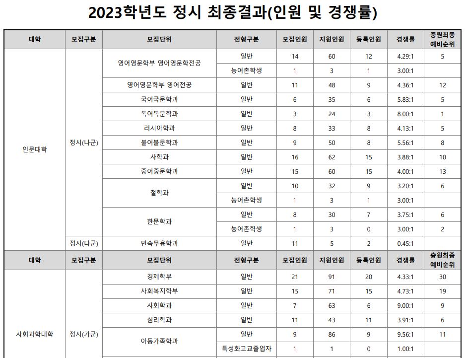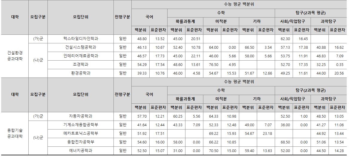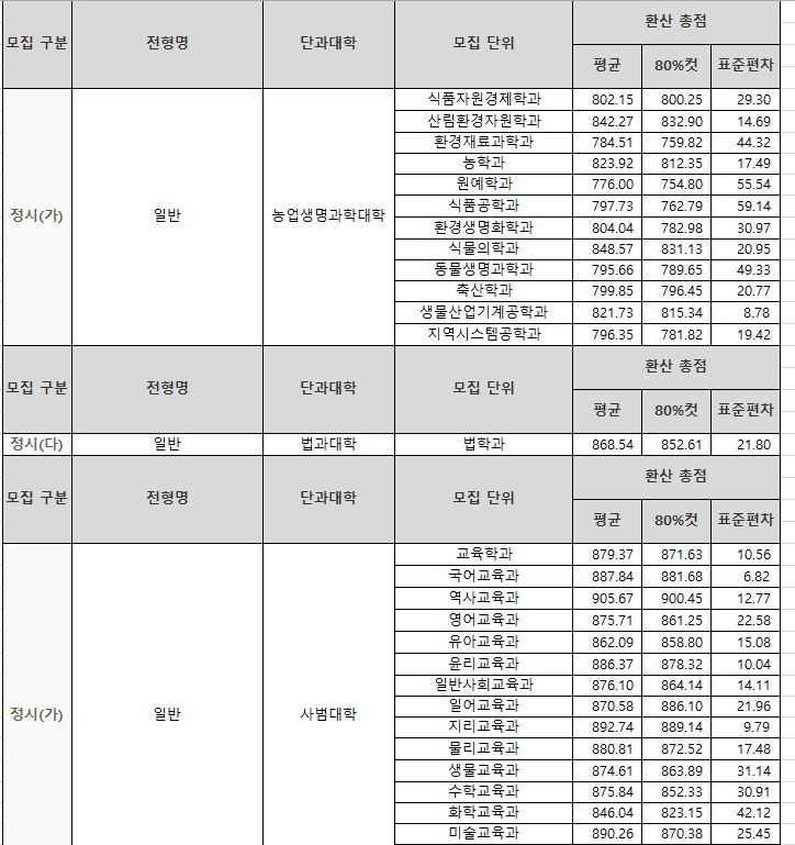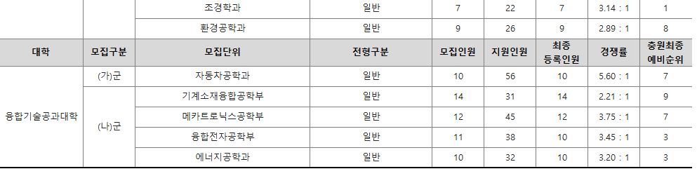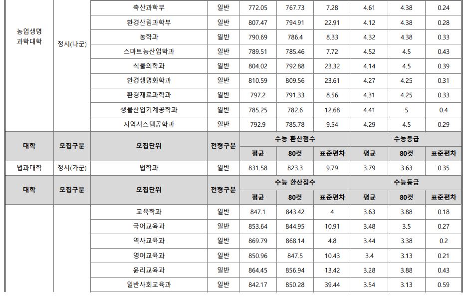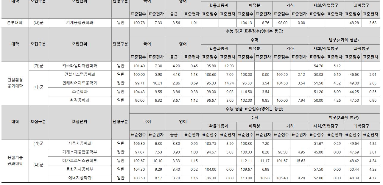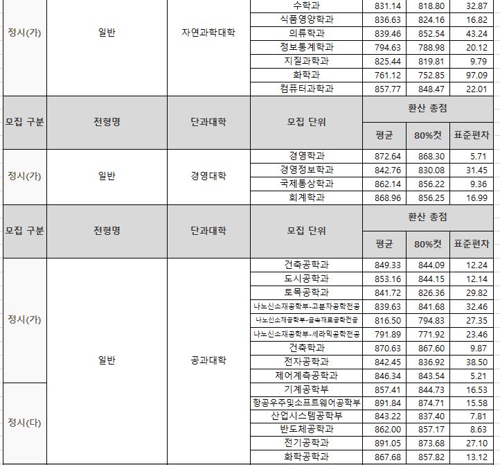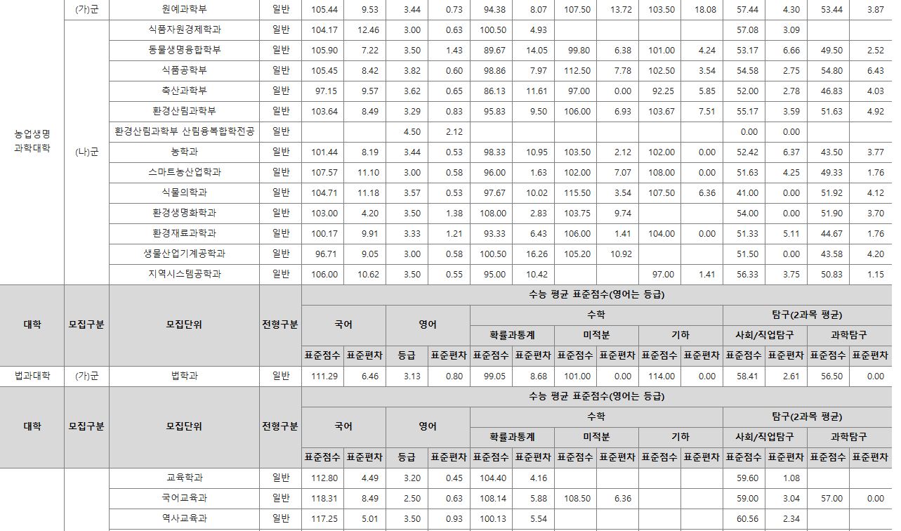 나군 : 영어영문학부 영어영문학전공, 영어영문학부 영어전공, 국어국문학과, 독어독문학과, 러시아어학과, 불어불문학과, 사학과, 중어중문학과, 철학과, 한문학과, 생명과학부, 물리학과, 수학과, 식품영양학과, 의류학과, 정보통계학과, 제약공학과, 지질과학과, 항노화신소재과학과, 화학과, 경영학부, 국제통상학부, 회계세무학부, 경영정보학과, 스마트유통물류학과, 산업경영학과, 건축공학부, 나노신소재공학부 고분자공학전공, 나노신소재공학부 금속재료공학전공, 나노신소재공학부 세라믹공학전공, 산업시스템공학부, 항공우주및소프트웨어공학부, 건축학과, 도시공학과, 반도체공학과, 전기공학과, 전자공학과, 제어로봇공학과, 토목공학과, 화학공학과, 식품자원경제학과, 동물생명융합학부, 식품공학부, 축산과학부, 환경산림과학부, 환경산림과학부 산림융복합학전공, 농학과, 스마트농산업학과, 식물의학과, 환경생명화학과, 환경재료과학과, 생물산업기계공학과, 지역시스템공학과, 기계융합공학과, 건설시스템공학과, 인테리어재료공학과, 조경학과, 환경공학과, 디자인비즈니스학과, 기계소재융합공학부, 메카트로닉스공학부, 융합전자공학부, 에너지공학과, 미래자동차공학과, 휴먼헬스케어학과