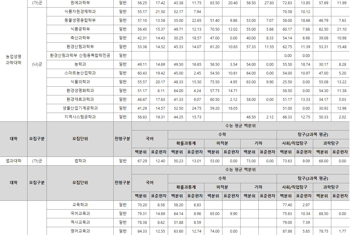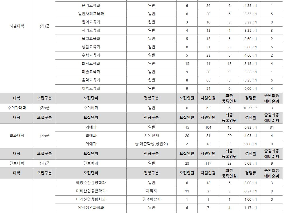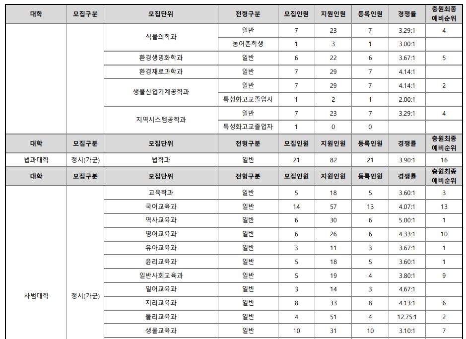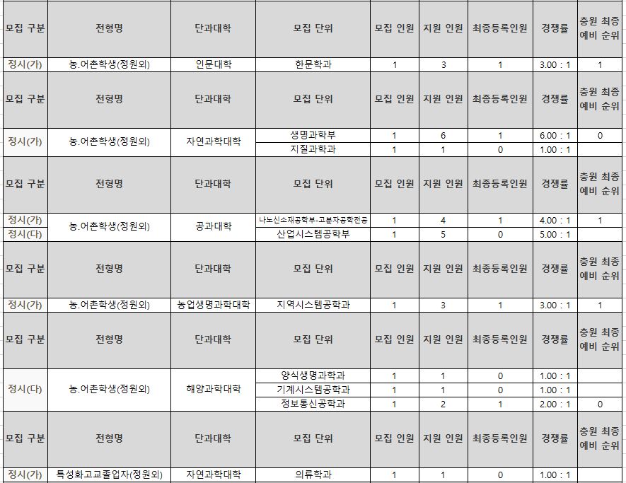 가군 : 기계융합공학과, 국어국문학과, 독어독문학과, 러시아학과, 불어불문학과, 사학과, 영어영문학과, 중어중문학과, 철학과, 한문학과, 경제학과, 사회복지학과, 사회학과, 심리학과, 정치외교학과, 행정학과, 생명과학부, 물리학과, 수학과, 식품영양학과, 의류학과, 정보통계학과, 지질과학과, 화학과, 컴퓨터과학과, 경영학과, 경영정보학과, 국제통상학과, 회계학과, 건축공학과, 도시공학과, 토목공학과, 나노신소재공학부-고분자공학전공, 나노신소재공학부-금속재료공학전공, 나노신소재공학부-세라믹공학전공, 건축학과, 전자공학과, 제어계측공학과, 식품자원경제학과, 산림환경자원학과, 환경재료과학과, 농학과, 원예학과, 식품공학과, 환경생명화학과, 식품의학과, 동물생명과학과, 축산학과, 생물산업기계공학과, 지역시스템공학과, 교육학과, 국어교육과, 역사교육과, 영어교육과, 유아교육과, 윤리교육과, 일반사회교육과, 일어교육과, 지리교육과, 물리교육과, 생물교육과, 수학교육과, 화학교육과, 미술교육과, 음악교육과, 체육교육과, 수의예과, 의예과, 간호학과, 한문학과(정원외), 생명과학부(정원외), 지질과학과(정원외), 나노신소재공학부-고분자공학전공(정원외), 산업시스템공학부(정원외), 지역시스템공학과(정원외), 의류학과(정원외)