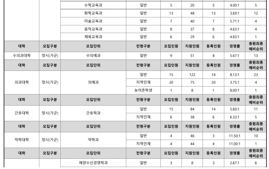 특성화고교졸업자(정원외)로 모집했던 에너지기계공학과, 조선해양공학과는 미달이었으며, 나머지 학과 중 경쟁률이 가장 높았던 학과는 수의예과(11.38:1), 반도체공학과(10.33:1), 법학과(8.50:1) 순이었습니다.