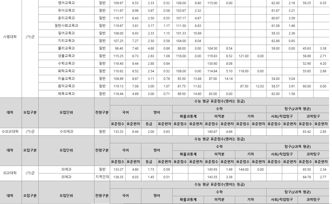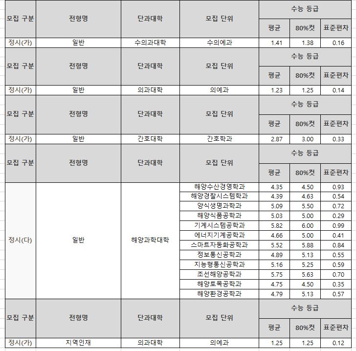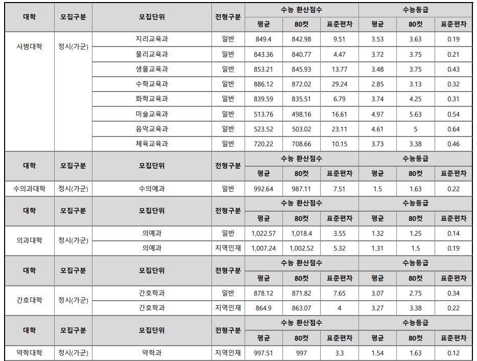 | [4년제/강원특별자치도 원주시/고성군/원주시/경기도 양주시] 2024학년도 정시 대비 경동대학교 3개년 정시 등급 (2021~2023년) (0) | 2023.12.20 |