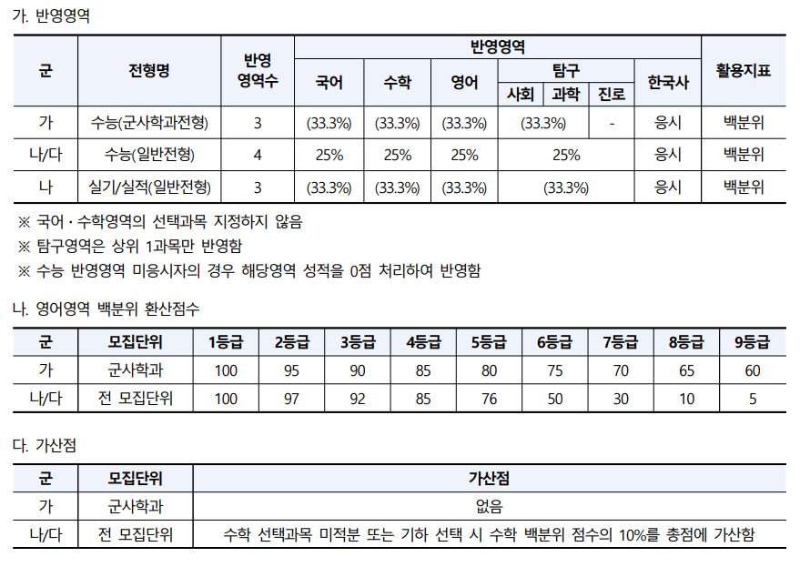 군사학과를 제외하고는 수학 선택과목으로 미적분이나 기하를 택할 경우 백분위 점수에 10%를 가산하여 계산합니다.