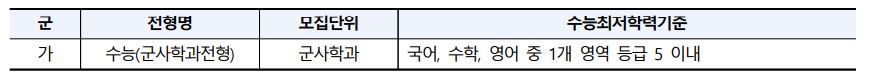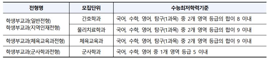 학생부교과(일반전형), 학생부교과(지역인재전형)의 간호학과는 2합 8, 물리치료학과는 2합 9이며, 학생부교과(체육교육과전형) 체육교육과는 2합 9입니다. 학생부교과(군사학과전형) 군사학과는 1합 5입니다.