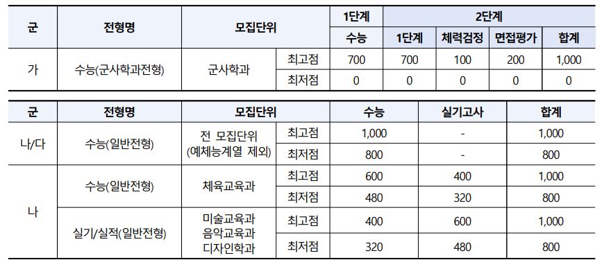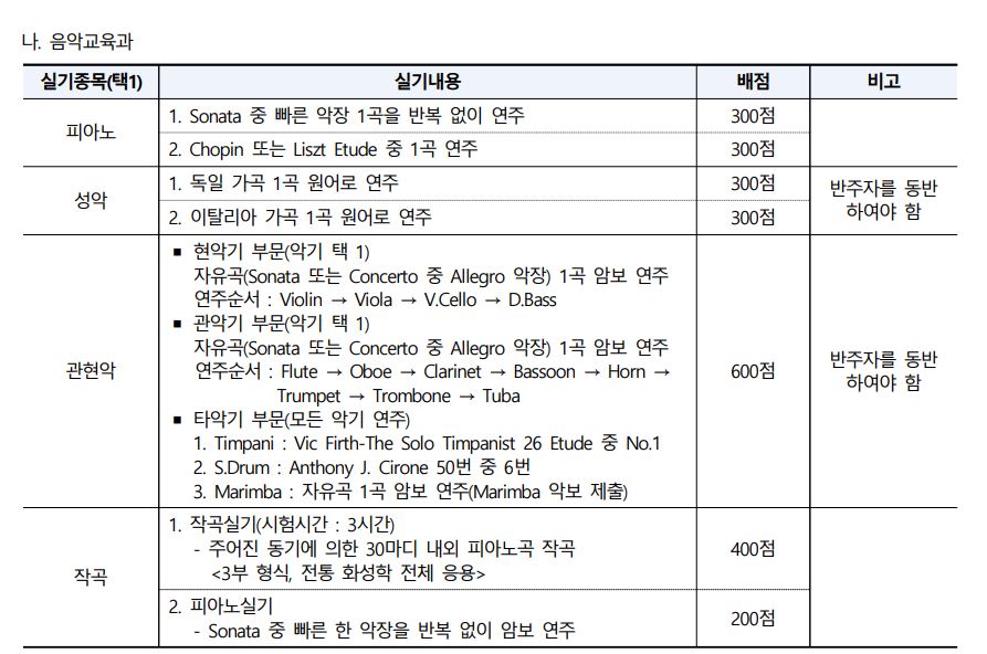 미술교육과, 음악교육과, 체육교육과, 디자인학과는 실기를 실시합니다.