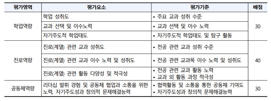 학생부종합(일반전형)에서는 학업역량, 진로역량, 공동체역량을 주로 보며 '진로역량'을 가장 크게 봅니다. 자세한 내용은 위와 같습니다.