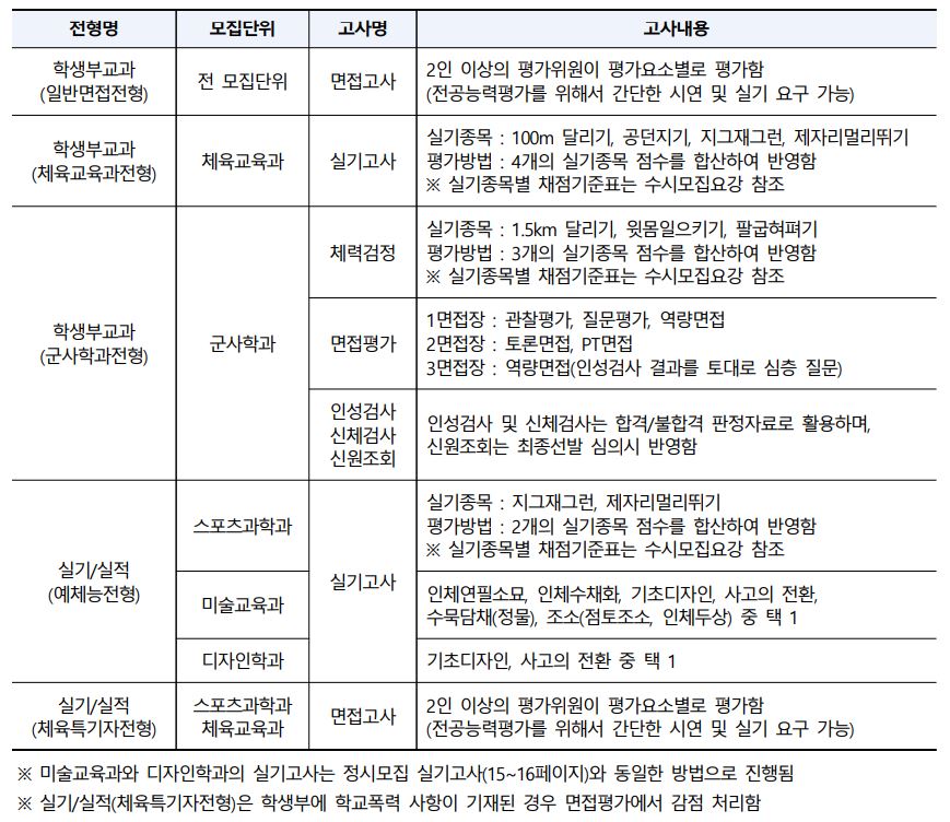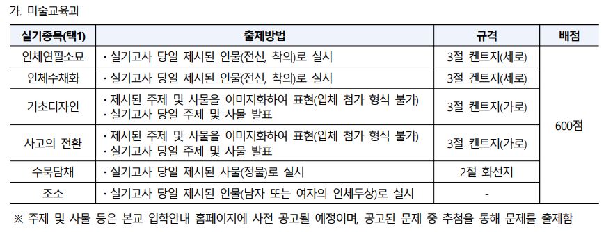 미술교육과는 인체연필소묘, 인체수채화, 기초디자인, 사고의 전환, 수묵담채, 조소 중 1, 음악교육과는 피아노, 성악, 관현악, 작곡 중 1, 체육교육과는 100m 달리기, 공던지기, 지그재그런, 제자리멀리뛰기를 모두 진행하며, 디자인학과는 기초디자인, 사고의 전환 중 택1로 실시합니다.