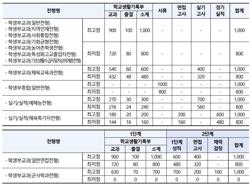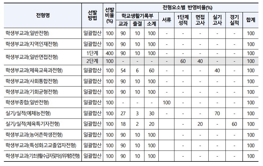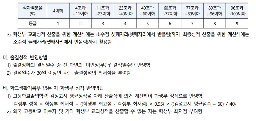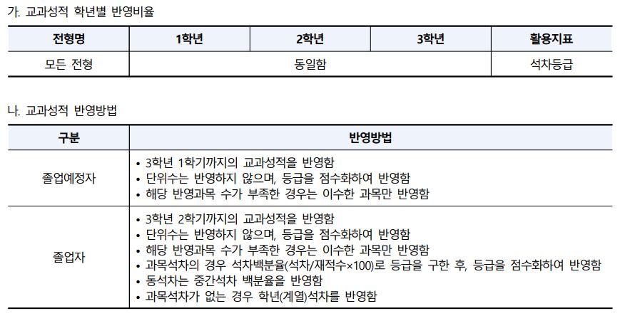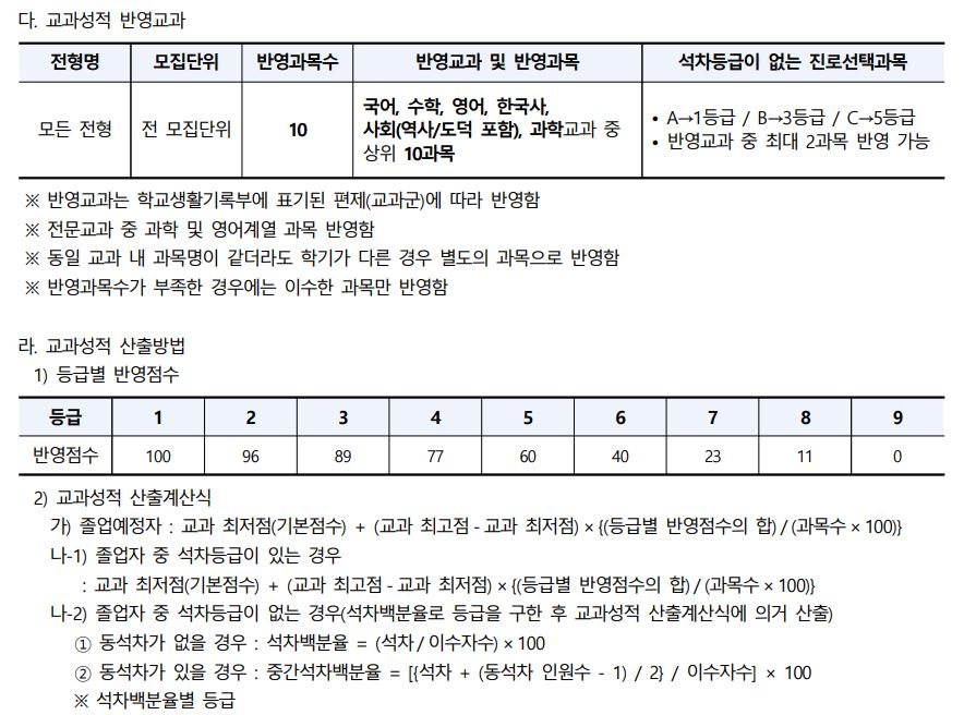 또한, 학생부 교과성적 반영방법이 변경되었는데요, 기존에는 국수영 상위 8과목 + 한국사, 사회(역사/도덕 포함), 과학교과 중 상위 2과목을 반영하였는데, 이제는 교과목 상관 없이 국수영한사(역/도 포함)과 중 상위 10과목을 반영합니다.