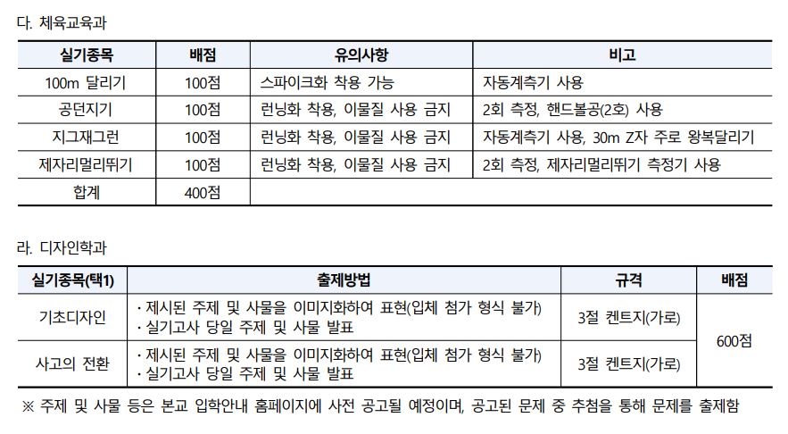 실기/실적(예체능전형)의 스포츠과학과는 지그재그런, 제자리멀리뛰기를 실시하며, 미술교육과는 인체연필소묘, 인체수채화, 기초디자인, 사고의 전환, 수묵담채(정물), 조소(점토조소, 인체두상) 중 택1로, 디자인학과는 기초디자인, 사고의 전환 중 택1로 실기를 실시합니다.