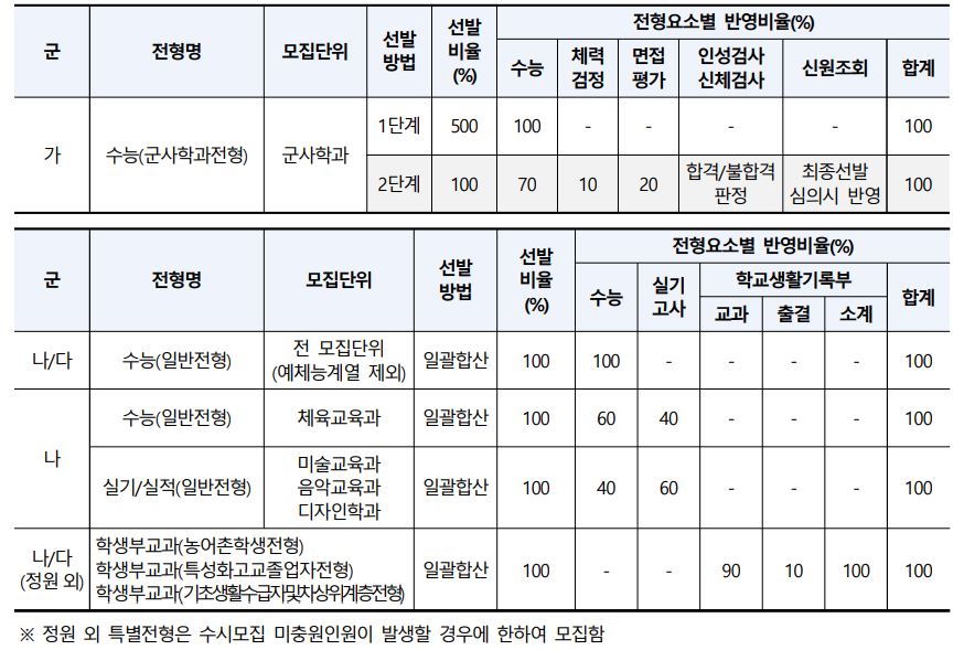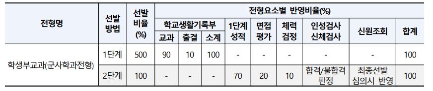 군사학과는 학교생활기록부로 1단계에서 5배수를 선발한 뒤에, 2단계에서 1단계 성적 70% + 면접 평가 20% + 체력 검정을 10% 반영하여 학생을 선발합니다. 또한, 인성검사와 신체검사도 실시하며 이는 합격/불합격 판정에만 영향을 주고 성적에는 반영되지 않습니다.