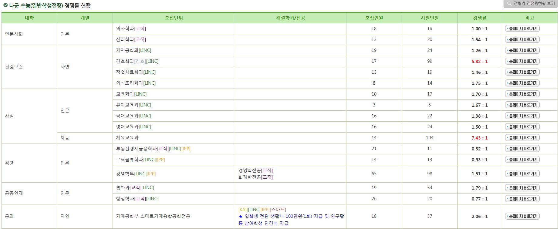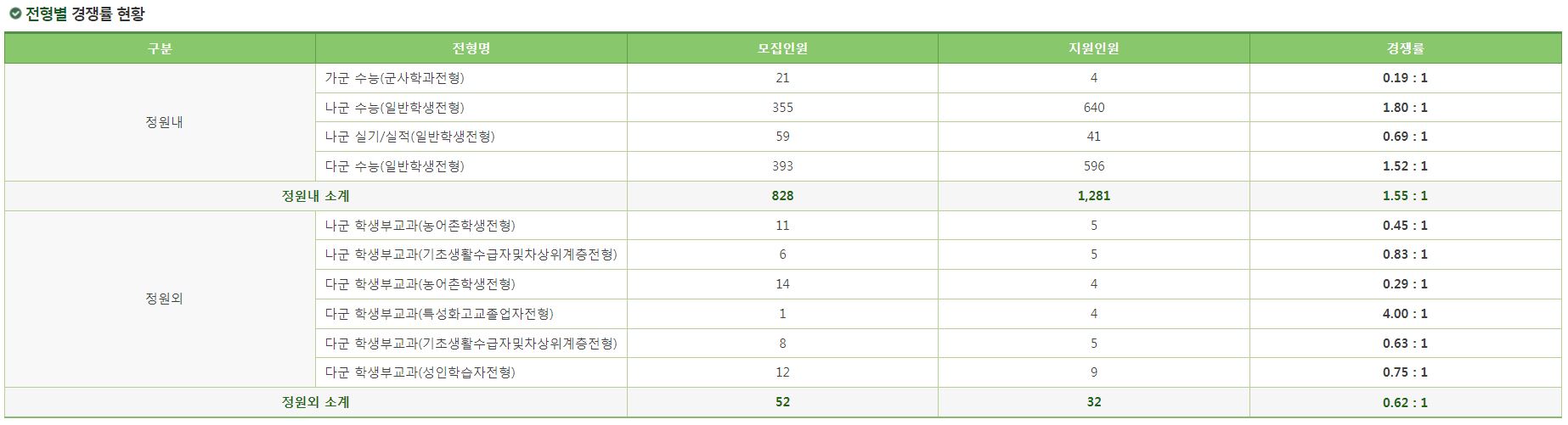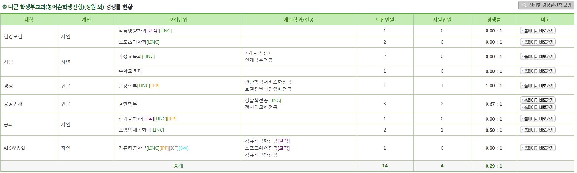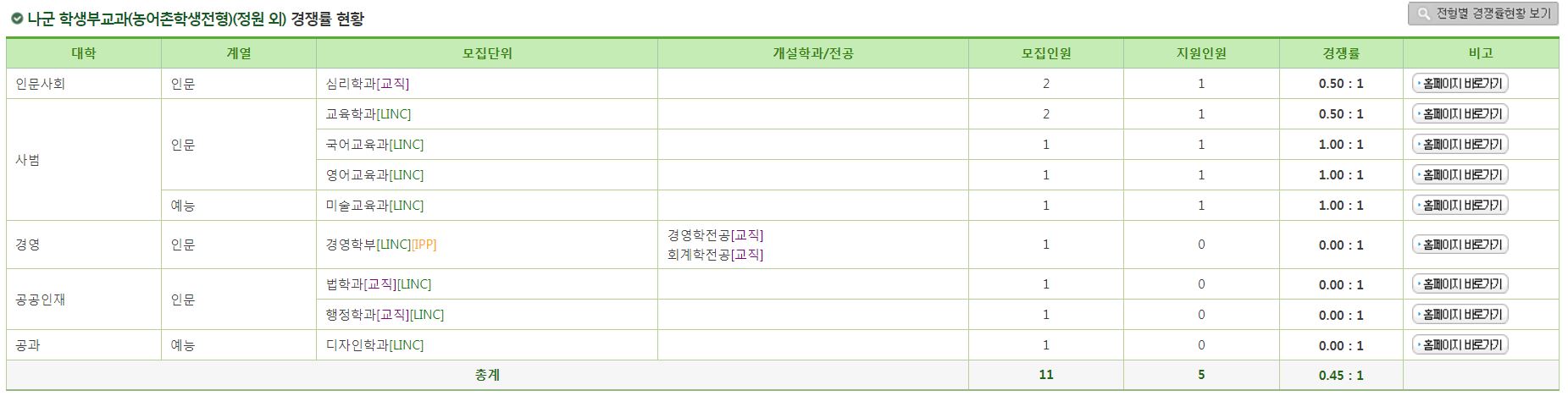 나군 학생부교과(농어촌학생전형)(정원 외) 경쟁률 현황