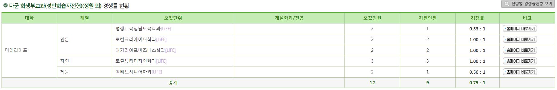 올해 경남대학교 학생부교과(성인학습자전형)의 평생교육상담보육학과, 액티브시니어학과는 미달이었으며, 로컬크리에이터학과, 여가라이프비즈니스학과, 토털뷰티디자인학과는 모집인원과 지원인원이 같았습니다.