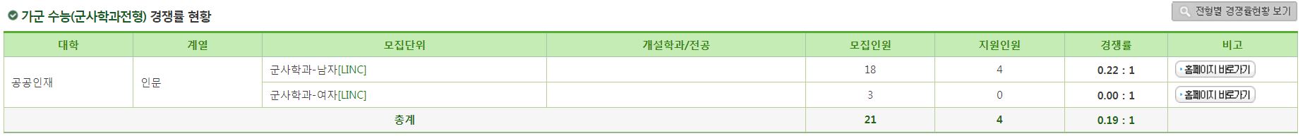 올해 경남대학교의 군사학과-남자, 군사학과-여자는 모두 미달이었습니다. 특히 군사학과-여자는 지원자가 아예 없었습니다.