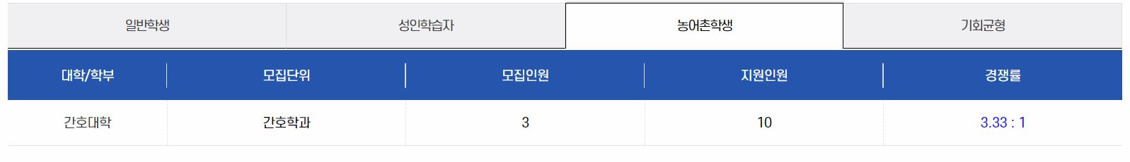 농어촌학생 전형에서는 간호학과의 신입생을 모집했으며, 경쟁률은 3.33:1 이었습니다.