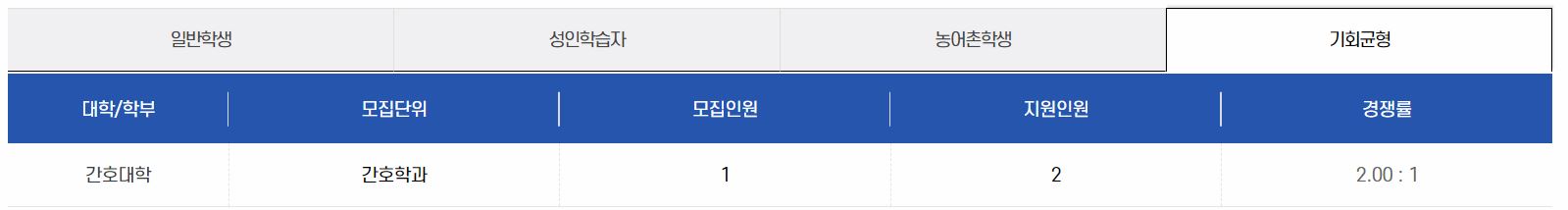 기회균형 전형에서는 간호학과의 신입생을 모집했으며, 경쟁률은 2.00:1 이었습니다.