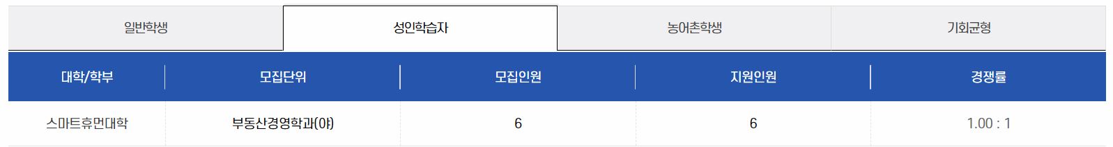 성인학습자 전형에서는 부동산경영학과(야)의 신입생을 모집했으며, 모집인원과 지원인원이 같았습니다.