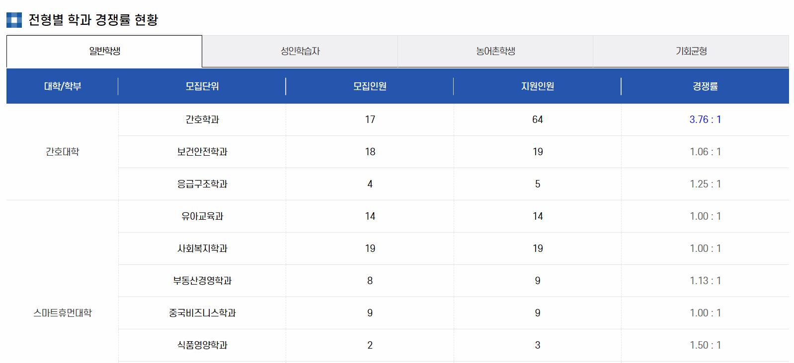 일반학생 전형의 유아교육과, 사회복지학과, 중국비즈니스학과, 미용예술학과, 디지털도시건설학과는 모집인원과 지원인원이 같았으며, 이외의 학과 중 가장 경쟁률이 높았던 학과는 간호학과(3.76:1), 식품영양학과(1.50:1), 응급구조학과(1.25:1), 음악학과(1.25:1) 순이었습니다.