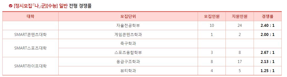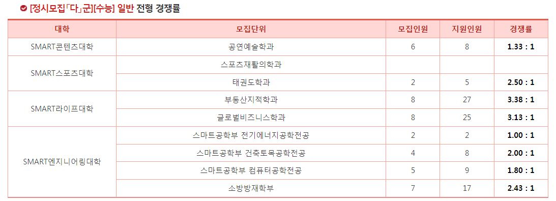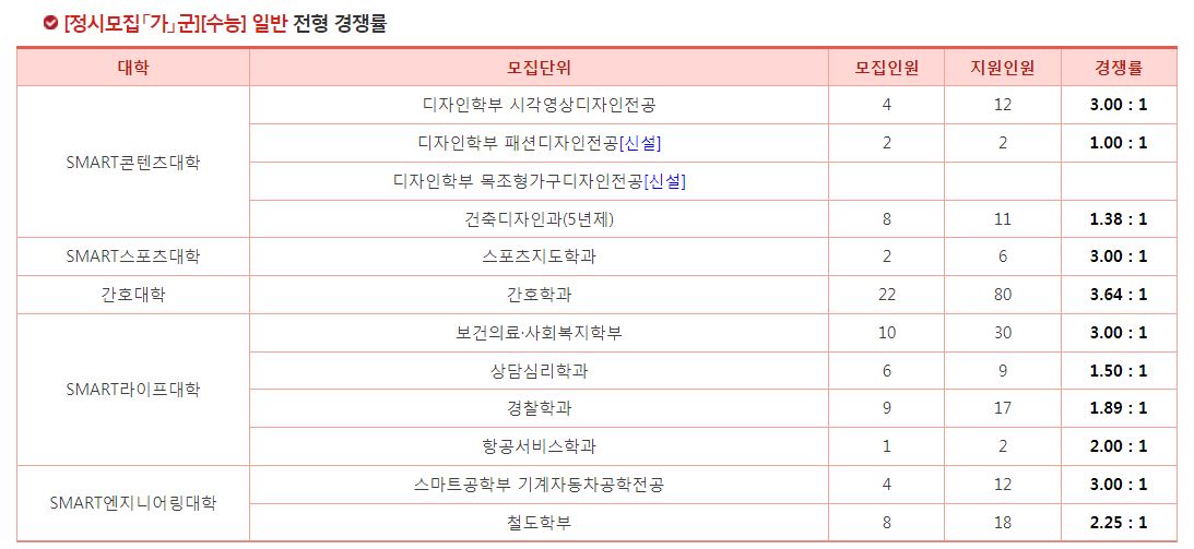 정시모집 가군 수능 일반전형의 디자인학부 패션디자인전공은 모집인원과 지원인원이 같았으며, 이외의 학과 중 가장 경쟁률이 높았던 학과는 간호학과(3.64:1), 디자인학부 시각영상디자인전공(3.00:1), 스포츠지도학과(3.00:1), 보건의료사회복지학부(3.00:1), 스마트공학부 기계자동차공학전공(3.00:1) 순이었습니다.