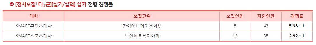 정시모집 다군 실기/실적 실기 전형에서는 만화애니메이션학부와 노인체육복지학과를 모집했으며, 만화애니메이션학부의 경쟁률은 5.38:1, 노인체육복지학과의 경쟁률은 2.92:1 이었습니다.