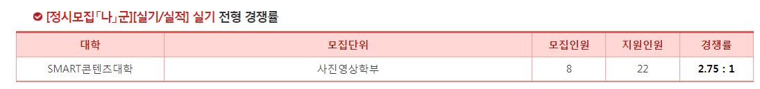 정시모집 나군 실기/실적 실기 전형에서는 사진영상학부를 모집했으며, 경쟁률은 2.75:1 이었습니다.