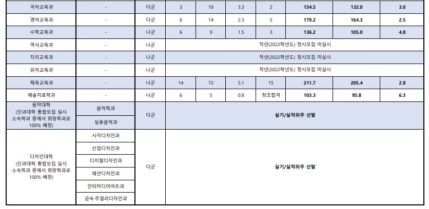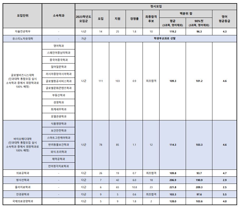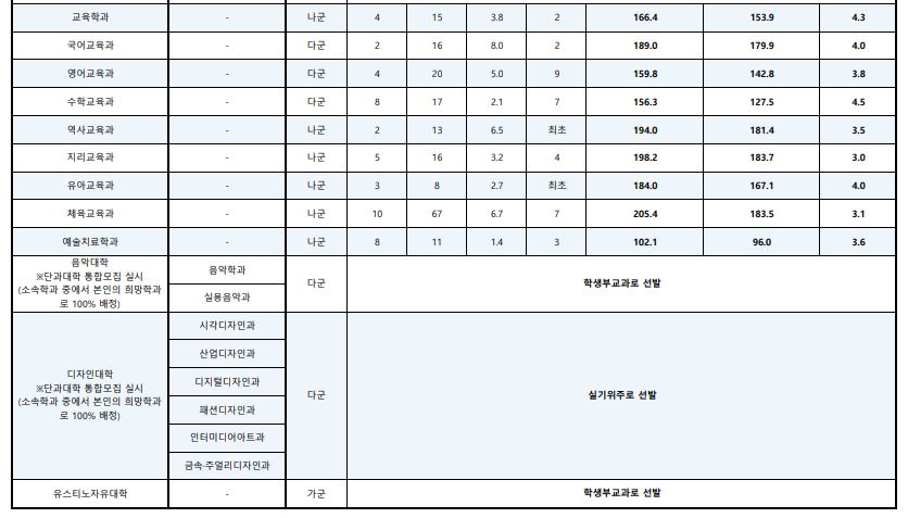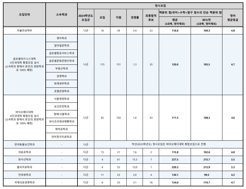 나군 : 자율전공학부, 글로벌비즈니스대학, 바이오메디대학, 간호학과, 약학부, 교육학과, 수학교육과, 역사교육과, 지리교육과, 유아교육과, 체육교육과, 예술치료학과