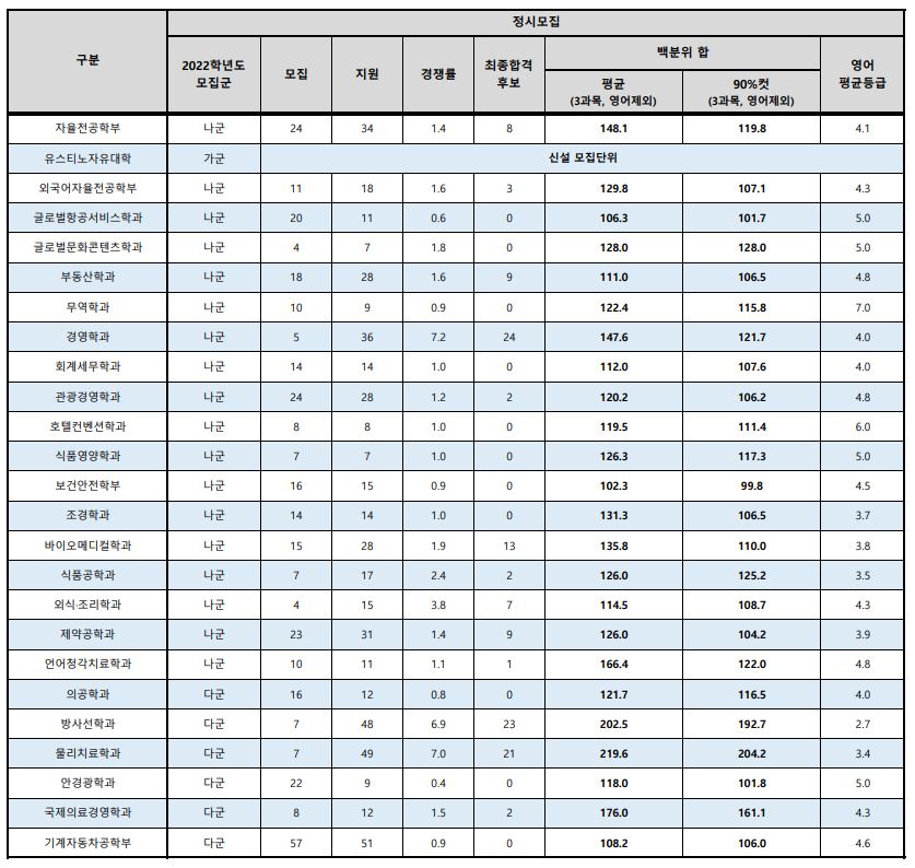 2021년 글로벌항공서비스학과, 무역학과, 보건안전학부, 의공학과, 안경광학과, 기계자동차공학부, 신소재화학공학부, 예술치료학과는 미달이었으며, 나머지 학과 중 가장 경쟁률이 높았던 학과는 의예과(12.5:1), 경영학과(7.2:1), 관현악과(5.0:1) 순이었습니다.