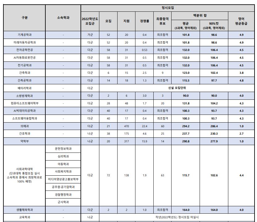 다군 : 의료공학과, 방사선학과, 물리치료학과, 안경광학과, 국제의료경영학과, 미래자동차공학과, 전기공학과, 건축학과, 건축공학과, 배터리공학과, 소방방재학과, 반도체전자공학과, 로봇공학과, 컴퓨터소프트웨어학부, AI빅데이터공학과, 소프트웨어융합학과, 의예과, 사회과학대학, 생활체육학과, 국어교육과, 영어교육과, 수학교육과, 음악대학, 디자인대학