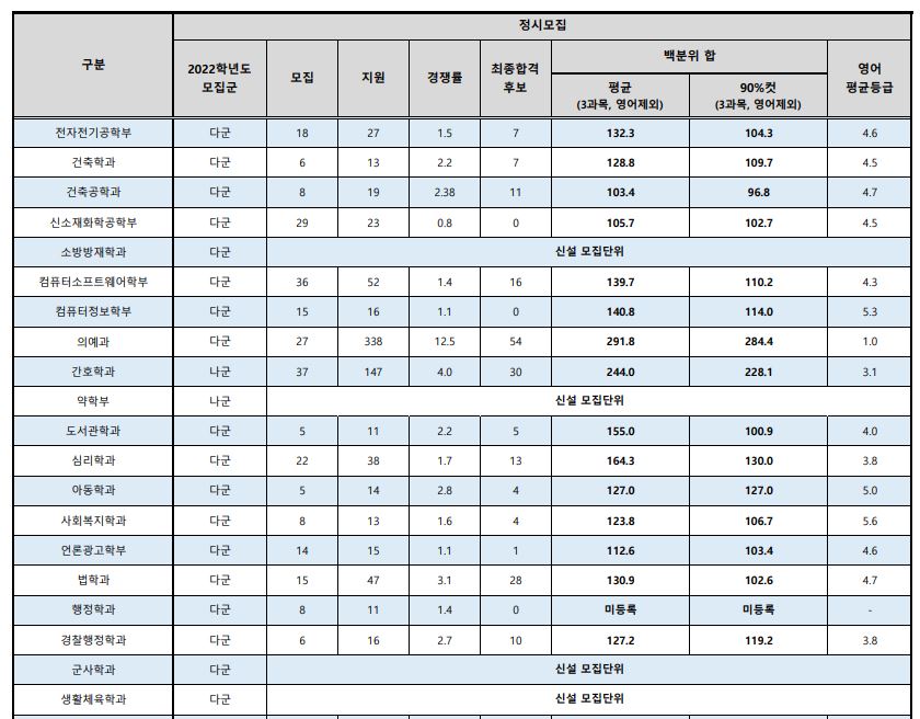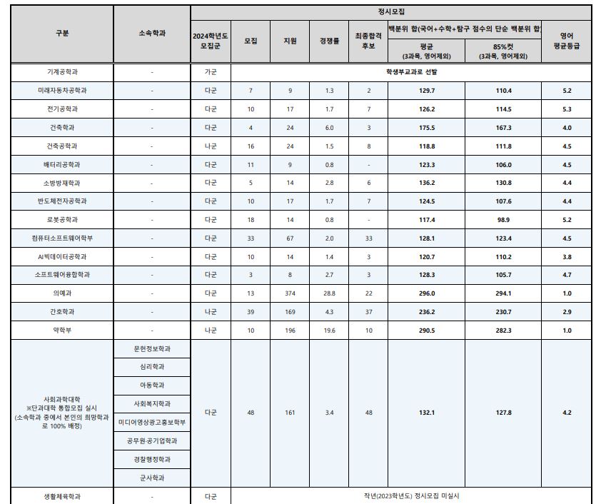 다군 : 의료공학과, 방사선학과, 물리치료학과, 안경광학과, 국제의료경영학과, 미래자동차공학과, 전자공학전공, AI자동화로봇전공, 전기공학과, 건축학과, 건축공학과, 배터리학과, 소방방재학과, 컴퓨터소프트웨어학부, AI빅데이터공학과, 소프트웨어융합학과, 의예과, 사회과학대학, 생활체육학과, 국어교육과, 영어교육과, 음악대학, 디자인대학
