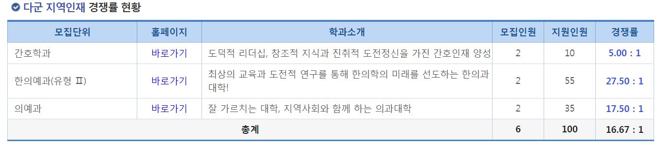 다군 지역인재 전형에서는 간호학과, 한의예과(유형2), 의예과 학생을 모집했으며, 간호학과의 경쟁률은 5.00:1, 한의예과(유형2)의 경쟁률은 27.50:1, 의예과의 경쟁률은 17.50:1 이었습니다.