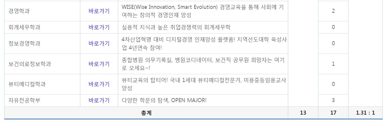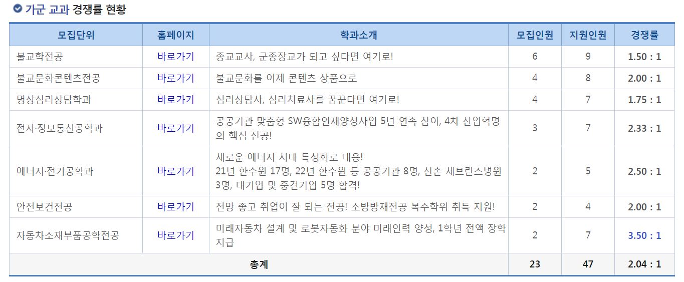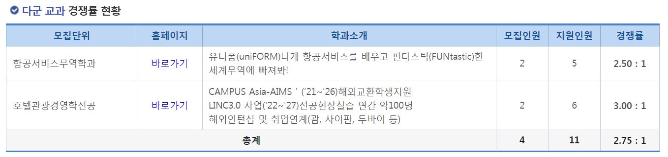 다군 교과 전형에서는 항공서비스무역학과, 호텔관광경영학전공의 신입생을 모집했으며, 항공서비스무역학과의 경쟁률은 2.50:1, 호텔관광경영학전공의 경쟁률은 3.00:1 이었습니다.