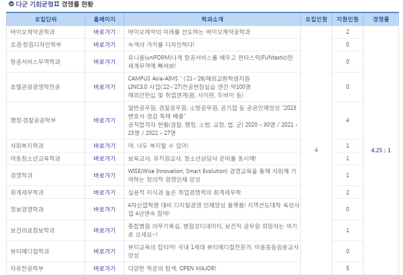 다군 기회균형2 전형 역시 학과를 통합하여 모집했으며, 경쟁률은 4.25:1 이었습니다.