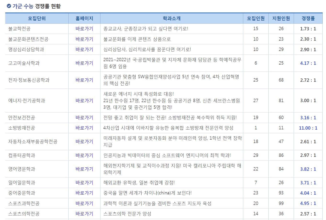 가군 수능전형에서 가장 경쟁률이 높았던 학과는 소방방재전공(11.00:1), 스포츠과학전공(4.95:1), 중어중문학과(4.04:1) 순이었습니다.
