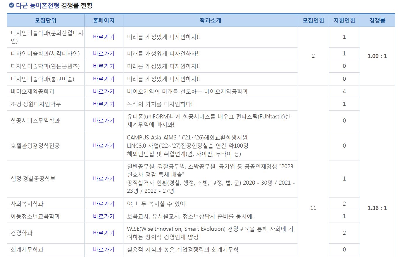 다군 농어촌전형에서는 학과를 통합하여 모집하였으며, 디자인미술학과의 모집인원과 지원인원은 같았으며, 나머지 학과들의 경쟁률은 1.36:1 이었습니다.