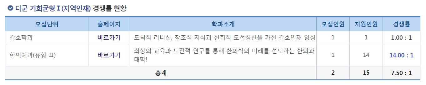 다군 기회균형1 (지역인재) 전형에서는 간호학과, 한의예과(유형 2)의 신입생을 모집했으며, 간호학과의 모집인원과 지원인원은 같았으며, 한의예과(유형2)의 경쟁률은 14.00:1 이었습니다.