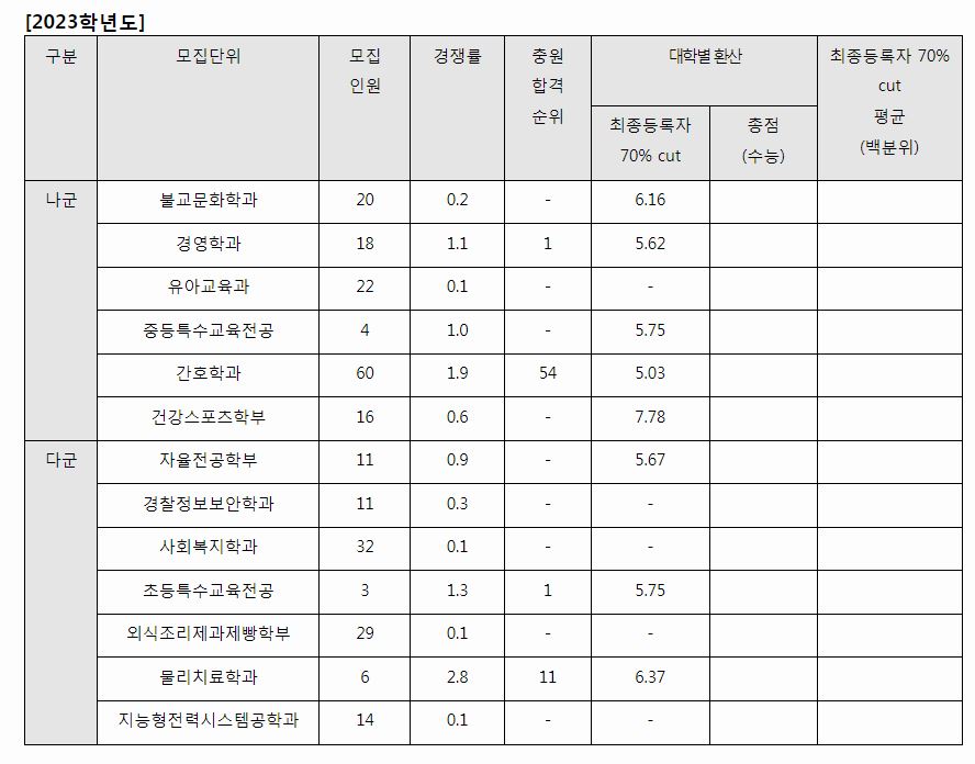 나군 : 불교문화학과, 경영학과, 유아교육과, 중등특수교육전공, 간호학과, 건강스포츠학부