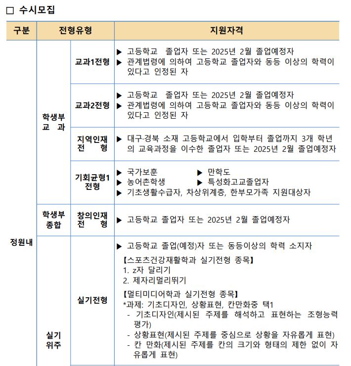 [4년제/경상북도 경산시] 경일대학교 2025학년도 대학입학전형 시행계획 (0) | 2024.04.22 |