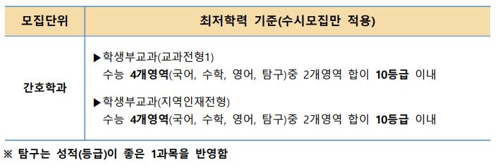 간호학과는 최저학력기준이 있으며, 교과전형1, 지역인재전형에서 4합 10 이내입니다. 탐구는 상위 1과목만 반영합니다.