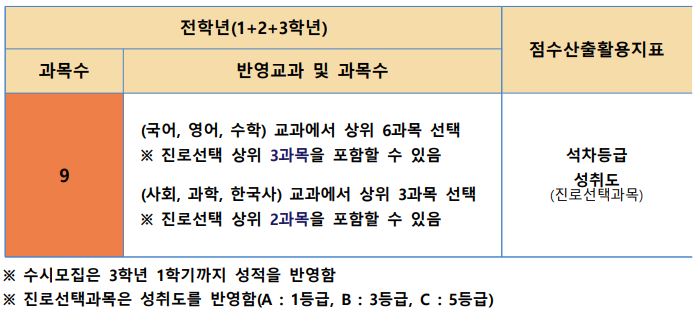 과목은 총 9개를 반영하며, 국영수 중에서 상위 6과목을 선택하며 진로선택은 상위 3과목을 포함할 수 있습니다. 탐구에서는 상위 3과목을 선택하며 진로선택 상위 2과목을 포함할 수 있습니다.