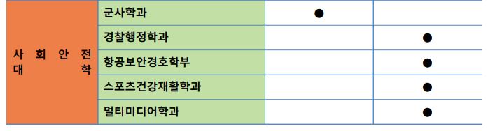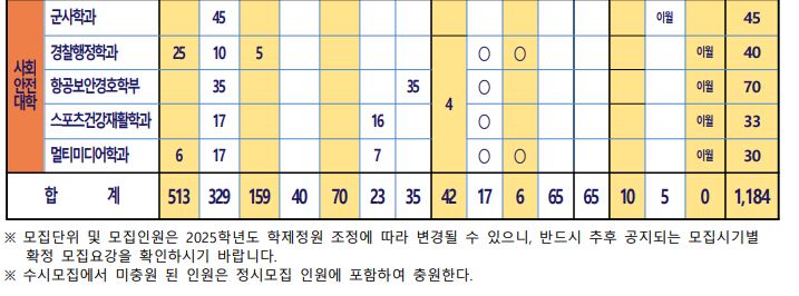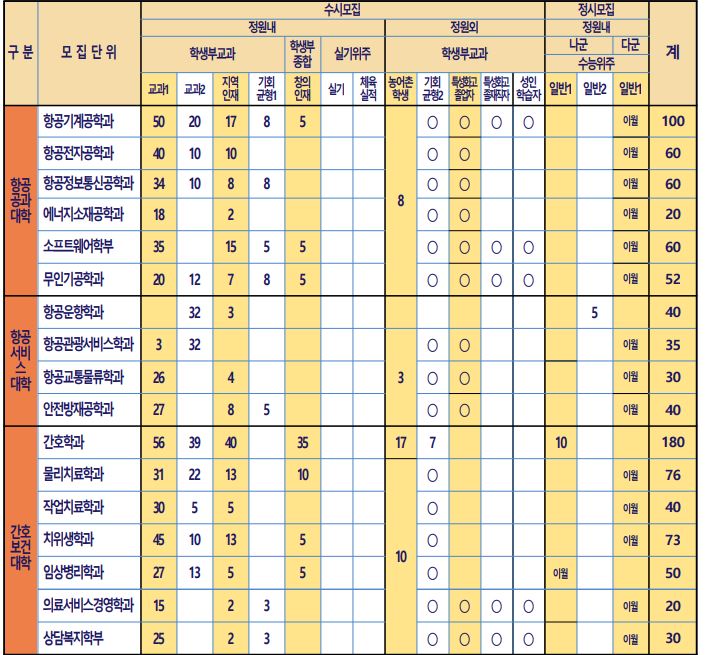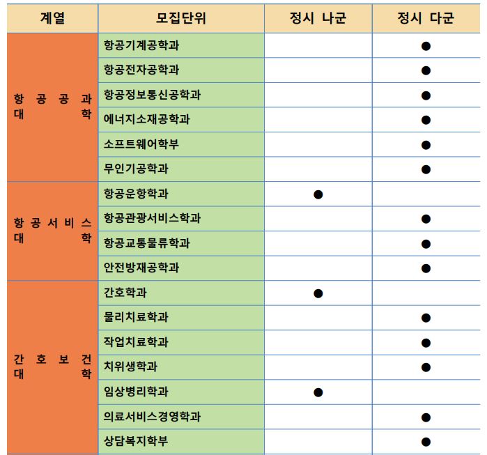 항공운항학과, 간호학과, 임상병리학과, 군사학과는 정시 나군에서, 나머지는 모두 정시 다군에서 모집합니다.