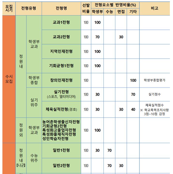 학생부종합은 학생부종합평가를 100%로, 스포츠, 멀티미디어 실기전형은 학생부 30% + 실기 70%로 학생을 선발할 예정이며, 체육실적전형(경호)는 학생부 30% + 면접 30% + 기타 40%로 학생을 선발합니다. 이 때 기타는 체육실적점수를 말하며, 학교폭력 기록이 있다면 3점에서 10점을 감점합니다.