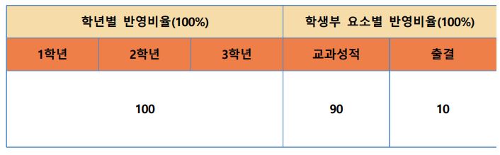 학교생활기록부 학년별 반영 가중치는 없으며, 교과성적 90% + 출결 10%를 반영합니다.