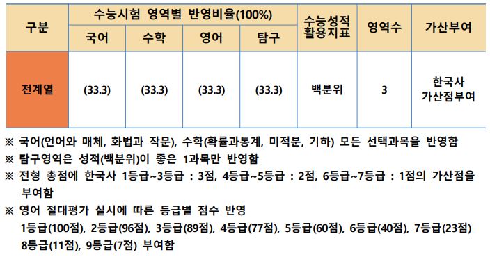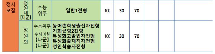 정시모집에서 일반1전형은 학생부 30% + 수능 70%로, 일반2전형은 수능 70% + 면접 30%를, 정원외 역시 학생부 30% + 수능 70%를 반영하여 학생을 선발할 예정입니다.