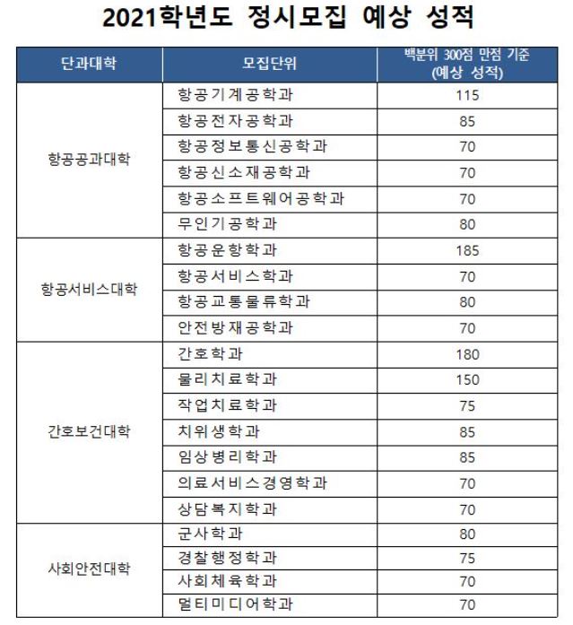 2021학년도는 위와 같으며, 역시나 항공서비스대학과 간호학과에 대해서만 보자면 항공운항학과의 백분위 예상 성적은 185, 항공서비스학과는 70, 항공교통물류학과는 80, 안전방재공학과는 70, 간호학과는 180 이었습니다.