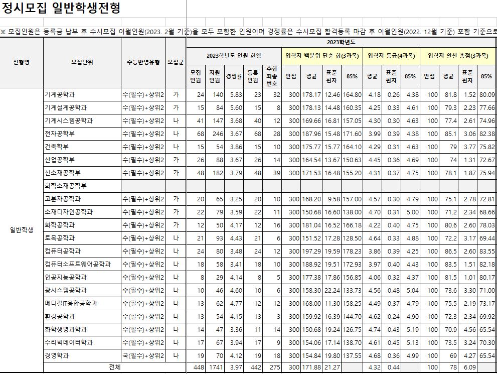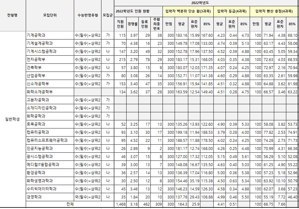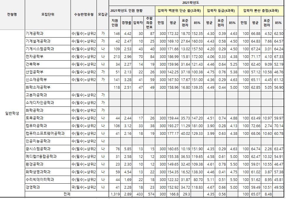 가군 : 기계공학과, 기계설계공학과, 산업공학부, 신소재공학부, 고분자공학과, 소재디자인공학과, 화학공학과