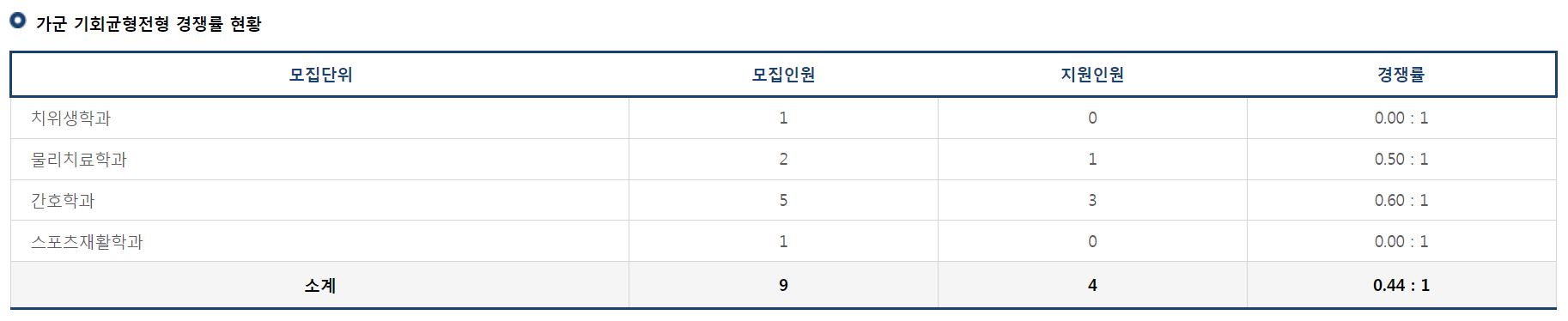 가군 기회균형전형으로는 치위생학과, 물리치료학과, 간호학과, 스포츠재활학과의 신입생을 모집했으며, 모두 미달이었습니다.
