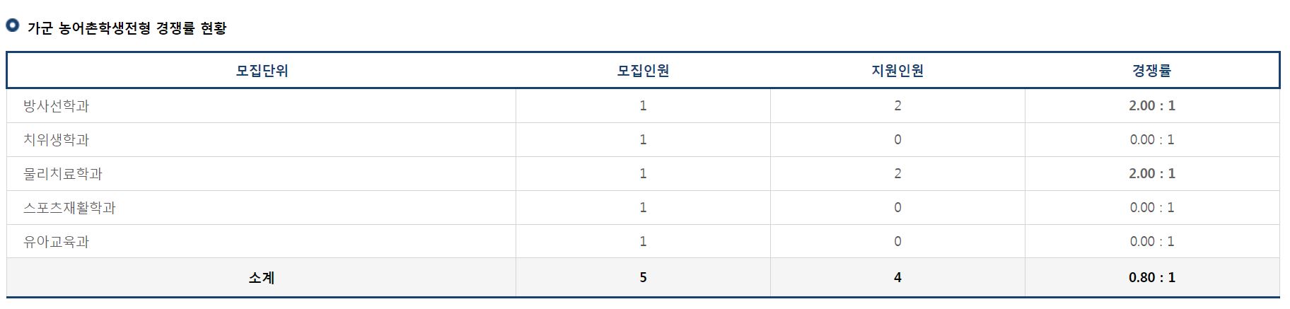 가군 농어촌학생전형의 치위생학과, 스포츠재활학과, 유아교육과는 미달이었으며, 방사선학과와 물리치료학과의 경쟁률은 각 2.00:1 이었습니다.