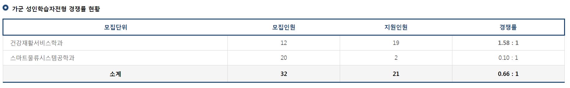 가군 성인학습자전형으로는 건강재활서비스학과, 스마트물류시스템공학과의 신입생을 모집했으며, 스마트물류시스템공학과는 미달이었고 건강재활서비스학과의 경쟁률은 1.58:1 이었습니다.