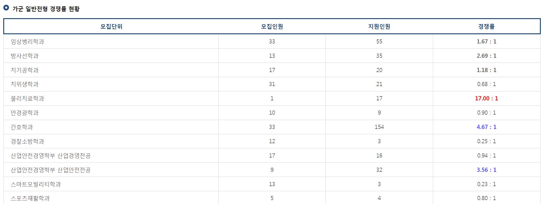 가군 일반전형의 치위생학과, 안경광학과, 경찰소방학과, 산업안전경영학부 산업경영전공, 스마트모빌리티학과, 스포츠재활학과, 사회복지상담학부 상담심리전공, 유아교육과, 생활체육학과는 미달이었으며, 이외의 학과 중 가장 경쟁률이 높았던 학과는 물리치료학과(17.00:1), 간호학과(4.67:1), 산업안전경영학부 산업안전전공(3.56:1) 순이었습니다.