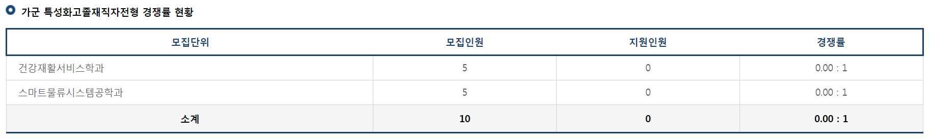가군 특성화고졸재직자전형으로는 건강재활서비스학과, 스마트물류시스템공학과의 신입생을 모집했으며, 모두 미달이었습니다.