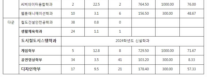 작년 의무군사학과, 유아교육과, 철도건설안전공학과는 미달이었으며, 이외의 학과 중 가장 경쟁률이 높았던 학과는 AI빅데이터융합학과(22.5:1), 게임학부(12.8:1), 디자인학부(9.5:1) 순이었습니다.