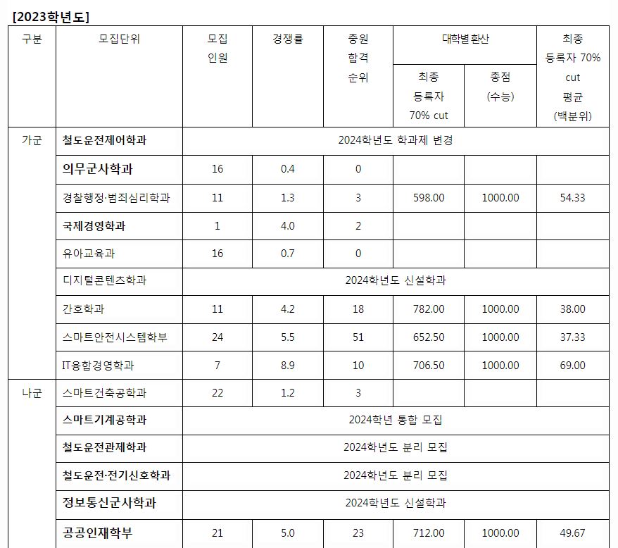 나군 : 스마트건축공학과, 스마트기계공학과, 철도운전관제학과, 철도운전전기신호학과, 정보통신군사학과, 공공인재학부, AI빅데이터융합학과, 웹툰애니메이션학과