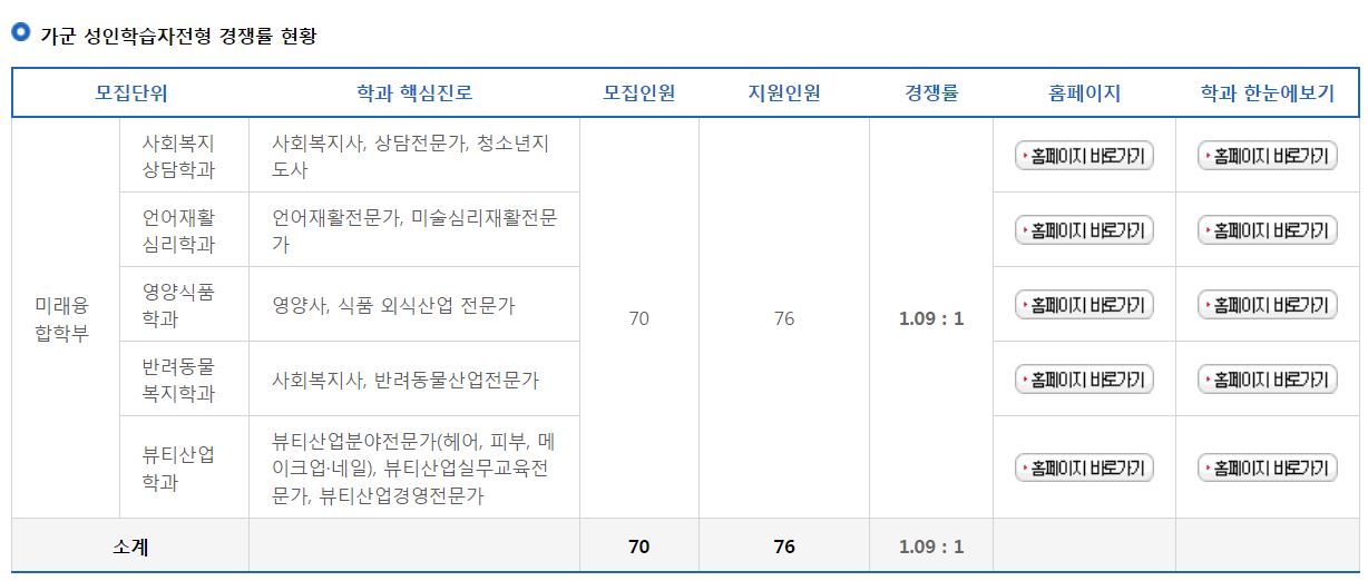 가군 성인학습자전형으로는 미래융합학부를 모집했으며, 경쟁률은 1.09:1 이었습니다.